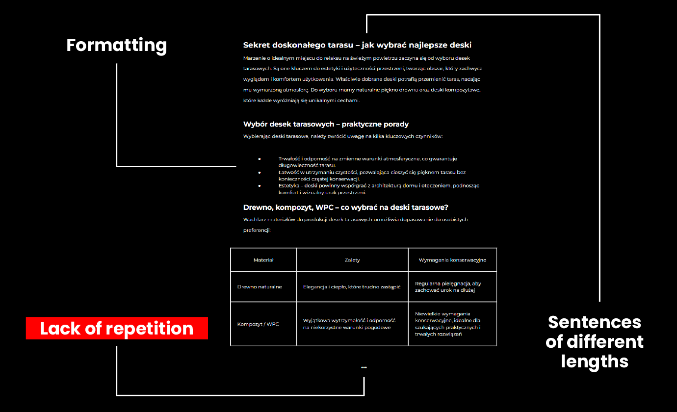 Seeing the clear benefits of detailed descriptions, it became essential to establish a solid content process. Before working with Senuto, the process was similar across content types, with differences mainly in how outlines were created. Performance Media had specific guidelines for each type of text, adjusting elements like: