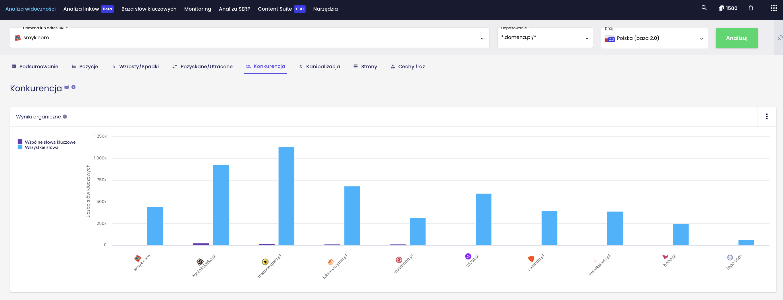 Te serwisy są Twoją konkurencją biznesową – oferują te same produkty co Ty, docierają do tych samych klientów. Jednocześnie mogą istnieć serwisy, które być może nie sprzedają butów, ale o nich piszą. A co za tym idzie, pozycjonują się na ważne dla Ciebie frazy kluczowe. Takich rywali możesz zidentyfikować po wpisaniu konkretnej frazy w wyszukiwarkę Google lub sprawdzić to jednym narzędziem w naszym module Analiza Widoczności.