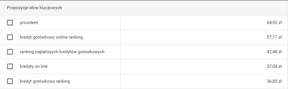 Najdroższe słowa kluczowe powiązane z frazą kredyt: