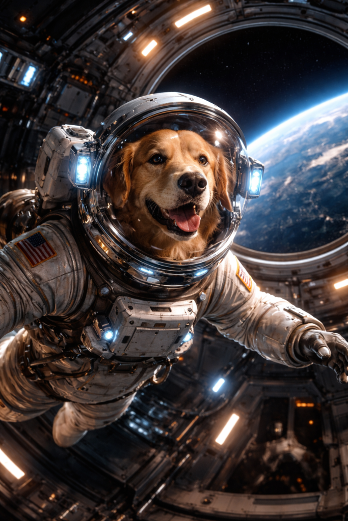 Oto konkretny przykład: Zamiast „pies w kosmosie”, użyj: „Złoty retriever w futurystycznym skafandrze kosmicznym, dryfujący wewnątrz stacji orbitalnej, widok na Ziemię przez iluminator, oświetlenie kinowe, styl hiperrealistyczny, wysoki kontrast”.