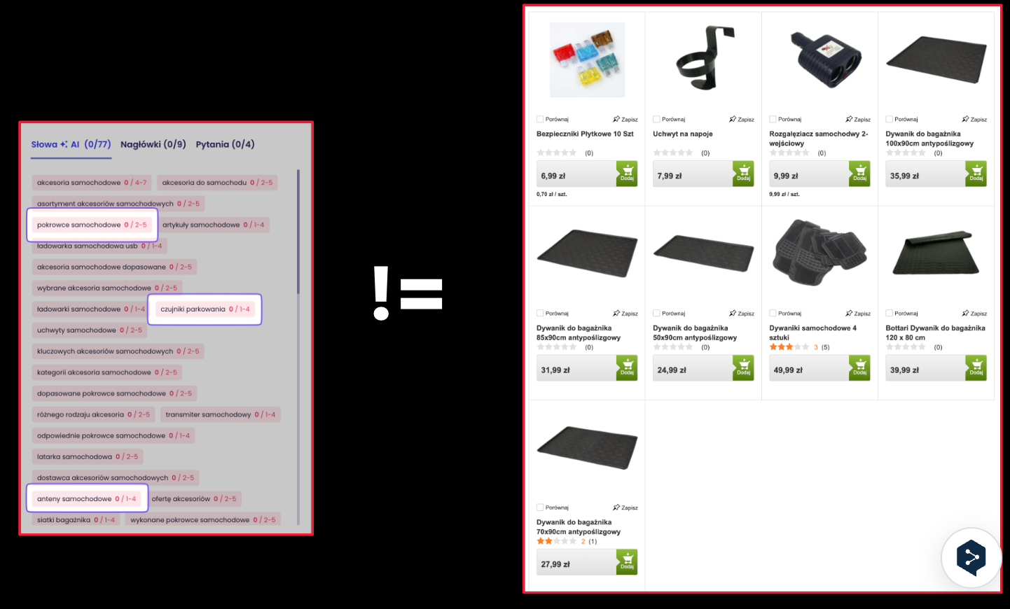Problem może być więc klasyczne podejście do researchu słów kluczowych. Co do zasady wszystkie narzędzia takie jak Senuto analizują w tym procesie strony konkurencji znajdujące się w SERP-ach. Z uwagi na różnice ofertowe słowa kluczowe nie zawsze są więc w 100% dopasowane do produktów znajdujących się w danym sklepie.