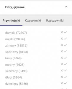 Korzystając z filtrów językowych, możesz zdecydować, czy Twoja lista fraz ma zawierać frazy zawierające poszczególne przykłady części mowy. Wystarczy kliknąć kliknąć ✅ przy tym słowie, które chcesz dodać lub ❌ obok tego, które chcesz wykluczyć.