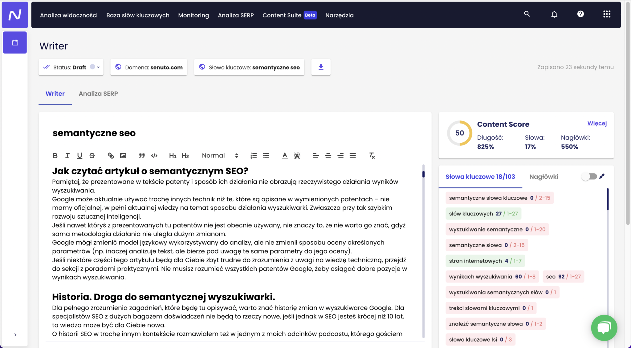 Od teraz zauważysz wyższe pokrycie sugerowanych słów w treści, a cały tekst jest lepiej dopasowany do tematu artykułu.