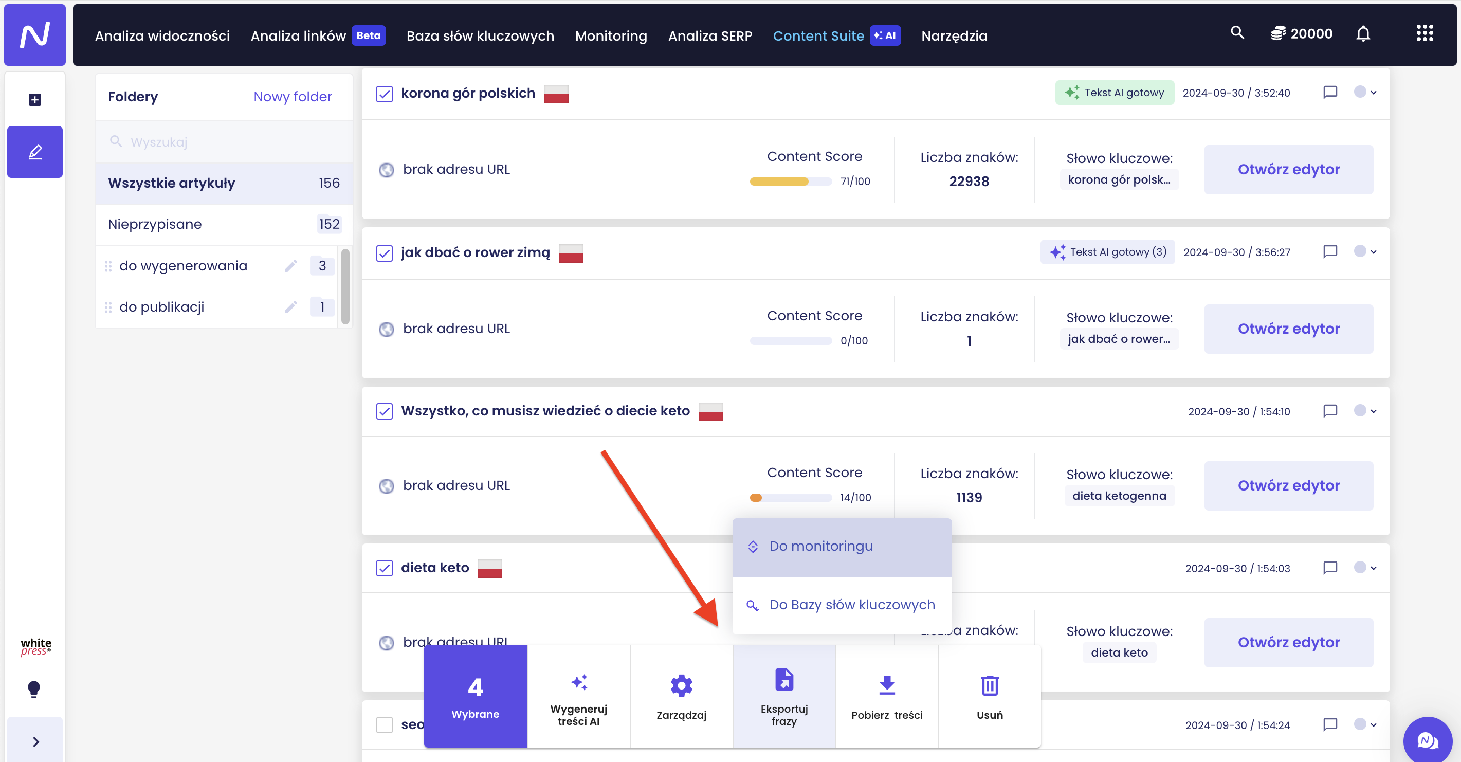 Wybierz taką liczbę artykułów, jaką jesteś w stanie napisać lub zaplanować wdrożenie na stronie w stosunkowo niedługim czasie. Teraz, za pomocą wygodnych checkboxów i filtrowania, możesz w łatwy sposób wybrać te artykuły, które spełniają Twoje oczekiwania i pozbyć się tych mniej trafionych. W tym momencie potrzebna jest Twoja uważność – w zależności od tego, ile artykułów wybierzesz, tyle limitu zostanie pobrane z Twojego pakietu.